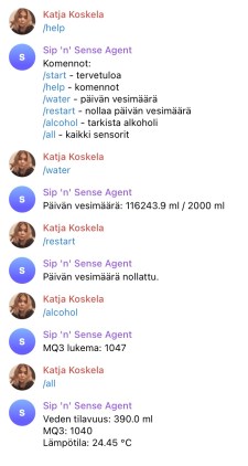 The outcome of the project was a working prototype that we are proud of. The mug can successfully detect its water level using the ultrasonic sensor, measure whether there is alcohol in the drink, read the temperature of the liquid with the infrared thermometer, and display the water level visually using LED lights. It sends information directly to our Telegram bot, where we can use simple commands such as /water, /alcohol, and /status to get live updates. While we initially planned to include GPS tracking, we decided to leave it out in the final version to keep the project simpler and more practical.